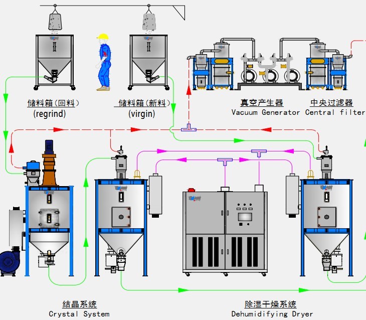 The NIASI crystal&drying system equipment with humanized designed which can easy and efficient assure the supply of dried resin material incessantly and steadily.