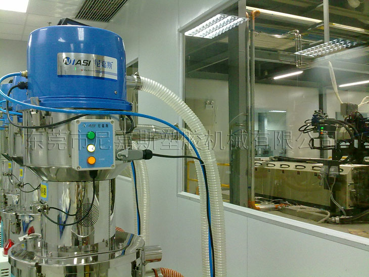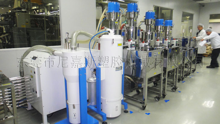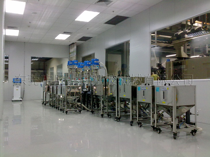 中央供料系統(tǒng)采用真空傳送方式,通過集中的管路系統(tǒng)將塑料原料從儲(chǔ)料罐輸送到中央除濕干燥系統(tǒng),然后將干燥后的原料輸送到每臺(tái)注塑機(jī)中。中央供料系統(tǒng)采用“一臺(tái)機(jī)器一根管”的設(shè)計(jì)方式,保證整個(gè)系統(tǒng)的空氣對(duì)原料進(jìn)行輸送,防止除濕干燥后的原料回潮。同時(shí)在每個(gè)輸運(yùn)行穩(wěn)定,絕無(wú)堵料的現(xiàn)象發(fā)生。它配合中央除濕干燥系統(tǒng)使用,可使用除濕干燥送循環(huán)后會(huì)對(duì)輸送管線進(jìn)行清理,確保管路內(nèi)沒有殘余的粒料,在避免原料回潮的同時(shí),也保證了加入注塑機(jī)中的原料性能的一致。在真空負(fù)壓作用下原料中原由的粉塵會(huì)通過粉塵過濾系統(tǒng)被過濾出來(lái),有助于提高成型產(chǎn)品的質(zhì)量。