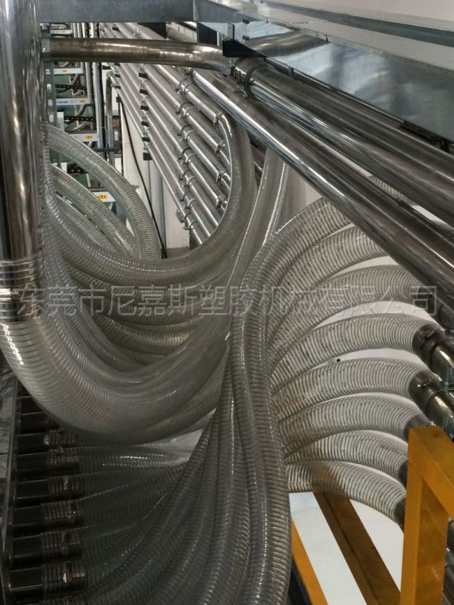 尼嘉斯中央供料系統(tǒng)采用一臺(tái)機(jī)一根管,密封式回路設(shè)計(jì)方式,保證整個(gè)系統(tǒng)運(yùn)行穩(wěn)定,絕無塑膠回潮、堵料現(xiàn)象發(fā)生。它配合中央干燥機(jī)(除濕機(jī))系統(tǒng)使用,可使干燥空氣對(duì)原料進(jìn)行再次干燥,防止干燥后的塑膠回潮,同時(shí)在每個(gè)輸送循環(huán)后對(duì)輸送管進(jìn)行清理,確保管道內(nèi)沒有殘料。在避免原料回潮的同時(shí)也保證加入注塑機(jī)中原料一致性,在真空負(fù)壓同進(jìn)作用下,原料中原有的粉塵經(jīng)過過濾器(集塵器)系統(tǒng)濾出,有利提高產(chǎn)品質(zhì)量。