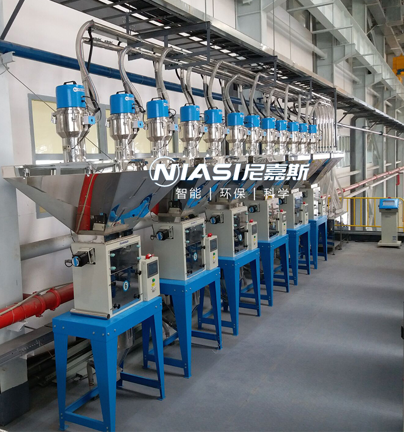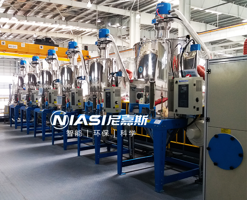 中央供料系統(tǒng)是根據(jù)客戶現(xiàn)場機臺的擺放情況對現(xiàn)場原料的用料情況,結(jié)合特有輔機設(shè)計備而設(shè)計的一種能夠?qū)崿F(xiàn)集中供料、集中控制,從而實現(xiàn)全廠無人化不間斷成型作業(yè)的整體性解決方案。