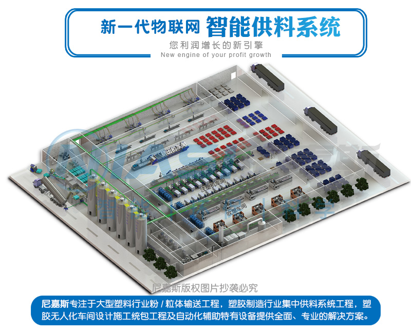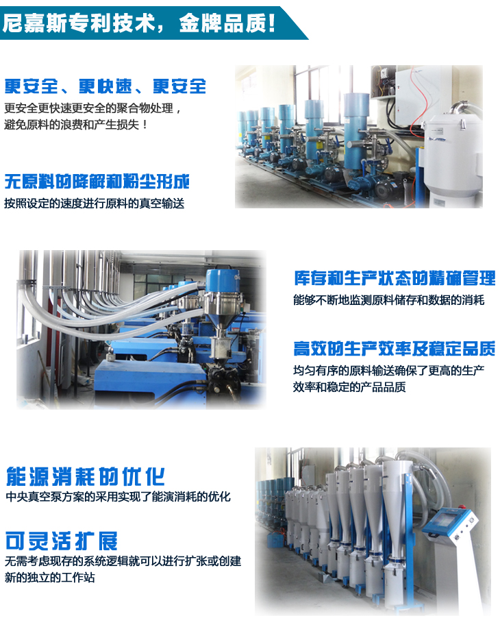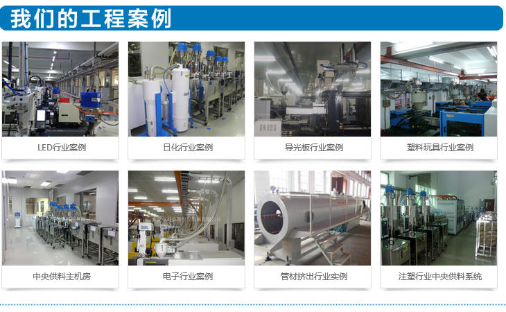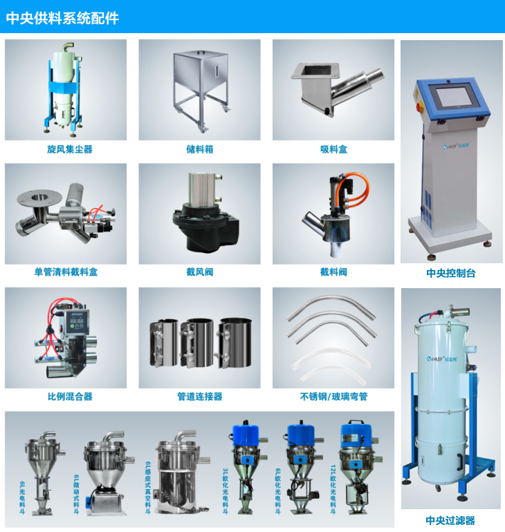 中央供料系統(tǒng)是為注塑車間的塑料產(chǎn)品生產(chǎn)而設(shè)計(jì)的,實(shí)現(xiàn)了不間斷無人化連續(xù)成型作業(yè)�?筛鶕�(jù)需要改變?cè)掀贩N、多顏色材料的組合使用方式,實(shí)現(xiàn)著色工序的自動(dòng)化。系統(tǒng)能夠以全自動(dòng)方式再生和使用注口冷料,能夠?qū)λ泄┝显O(shè)備的控制,并防止了儲(chǔ)料倉內(nèi)阻塞現(xiàn)象的發(fā)生,通過設(shè)置中央監(jiān)控臺(tái)實(shí)現(xiàn)全自動(dòng)化。